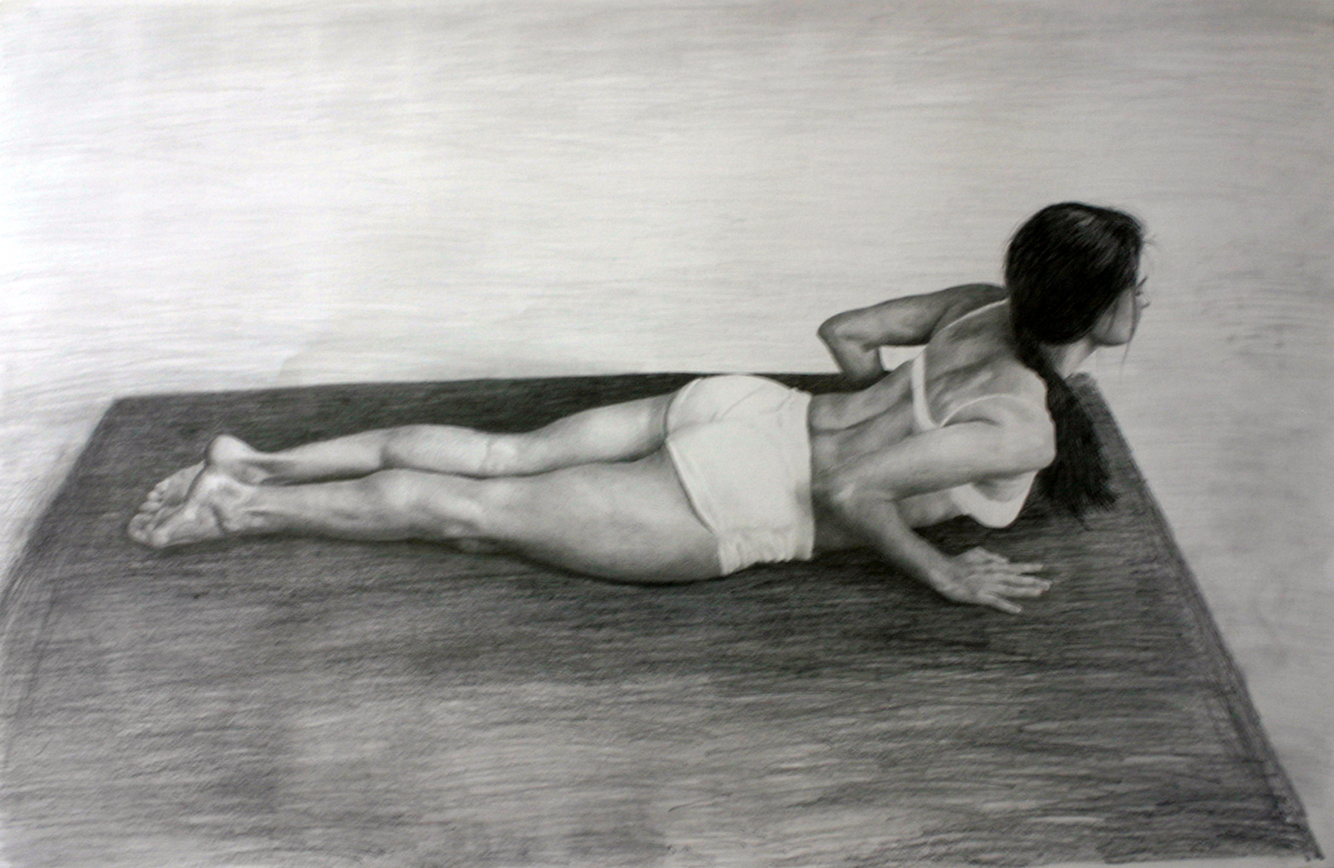 A calm, disciplined figure study of cobra pose, rendered with careful anatomy and soft tonal transitions. The body stretches long across the mat, palms planted, chest lifting into the turn of the head, capturing that balance between effort and ease that yoga demands. It’s minimal, grounded, and quietly intimate, a piece that brings stillness into a room without trying too hard.