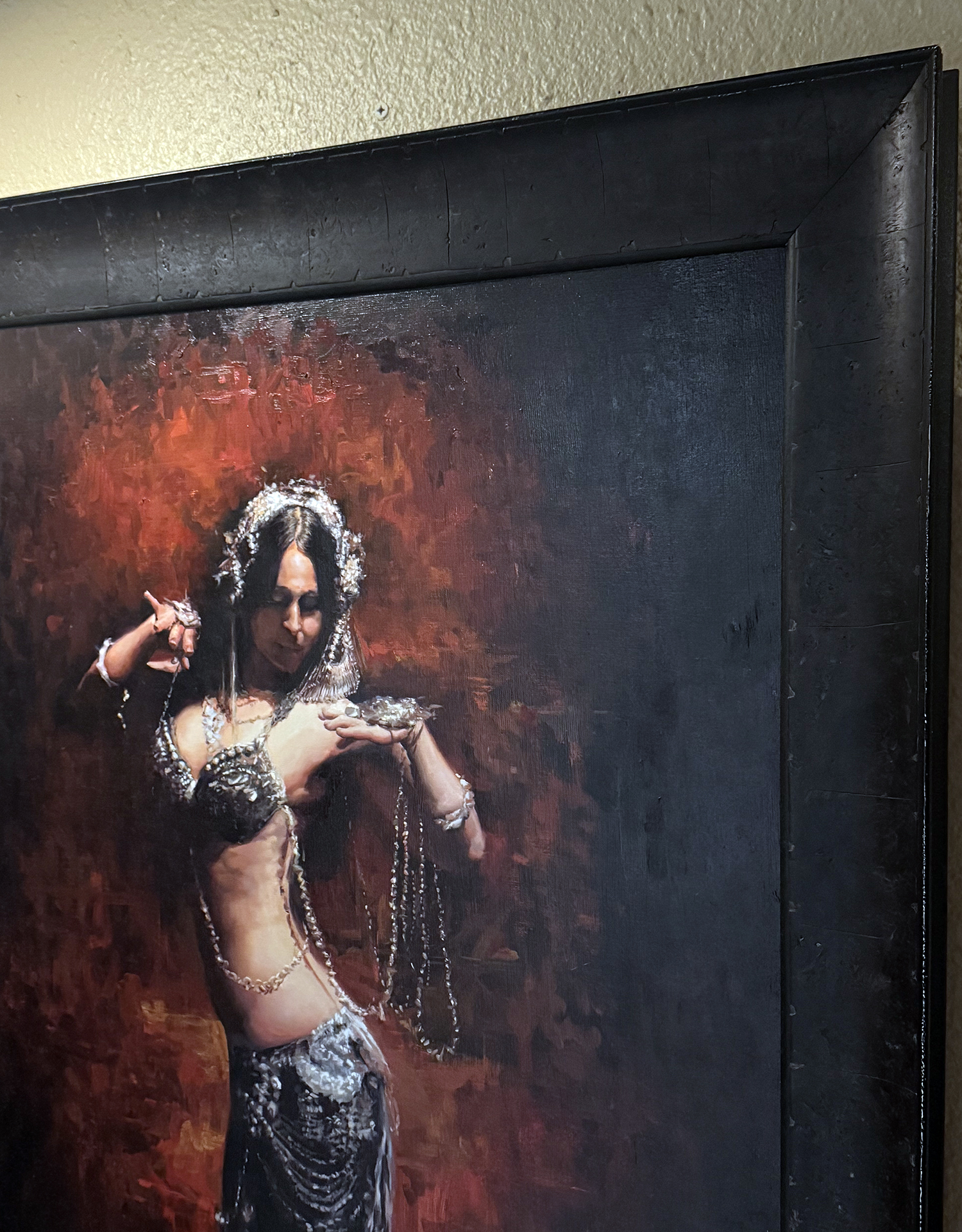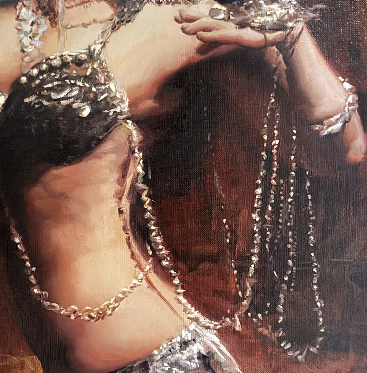 A luminous portrait of the belly dancer, Deb Rubin, suspended between stillness and motion, jeweled and radiant against a dark, ember red atmosphere. The light lands on skin and metallic ornament like a spotlight, while the edges dissolve into shadow, giving the piece a cinematic, stage-born intensity. Volupté is about presence, seduction, and power, the kind that comes from owning the moment, not asking permission.